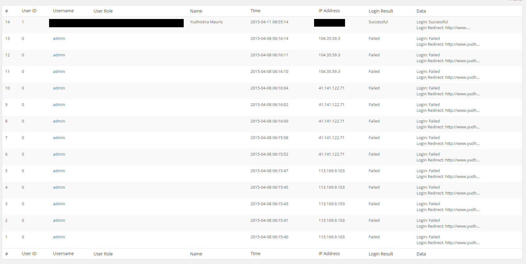 A few days ago, I was quite surprised when logging into this site. I saw a notification from Jetpack on my WP dashboard page that said it had blocked several malicious login attempts. Since I’ve installed simple login log plugin, I could see those attempts details. Here the screenshot of those malicious login attempts: